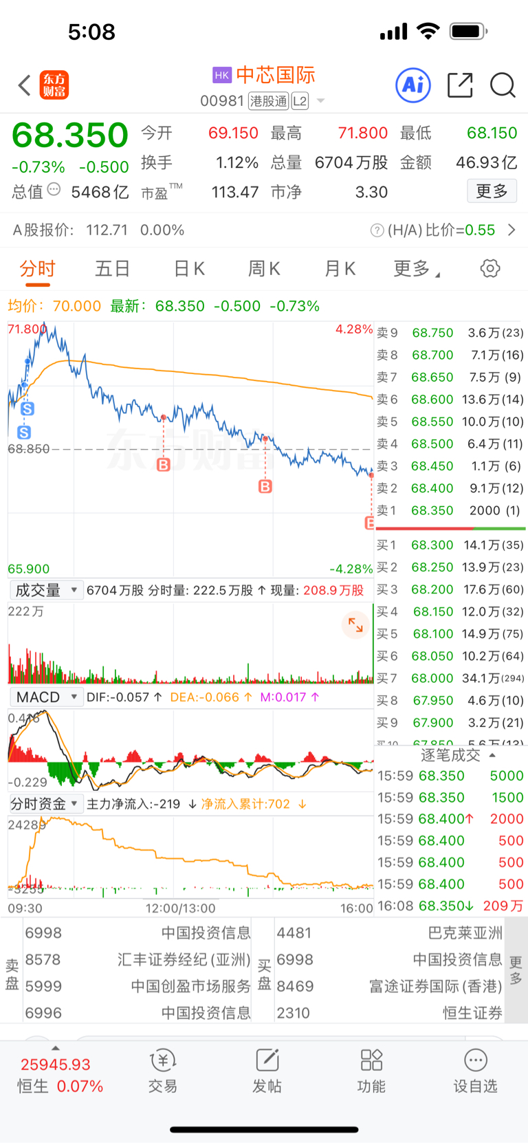 $中芯国际(HK|00981)$ 今天还想好看你一眼,,,让自己后悔卖飞了。真没想到,你也不争气呢。