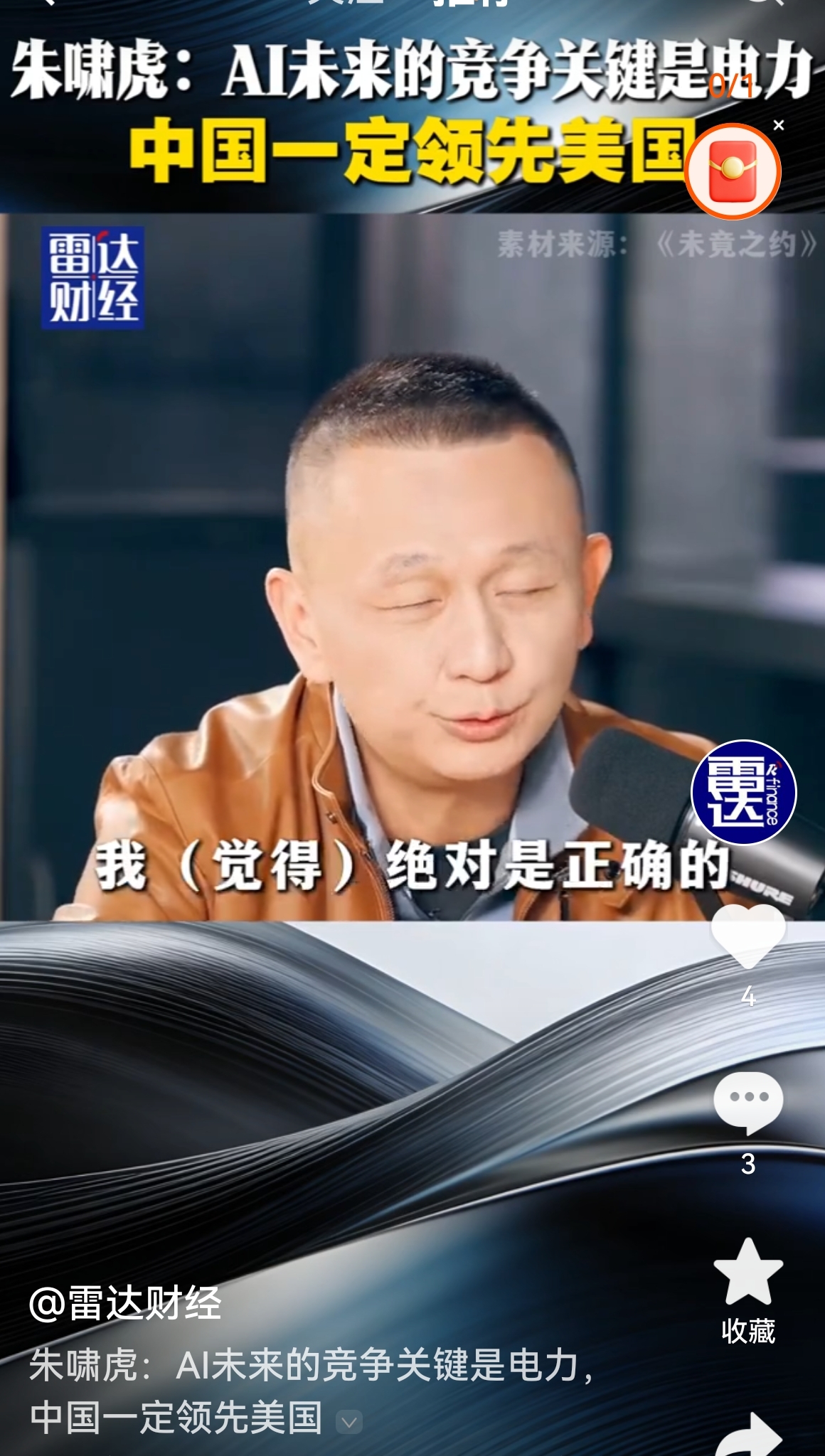朱啸虎:未来中美的竞争,不再是AI,而是电力。