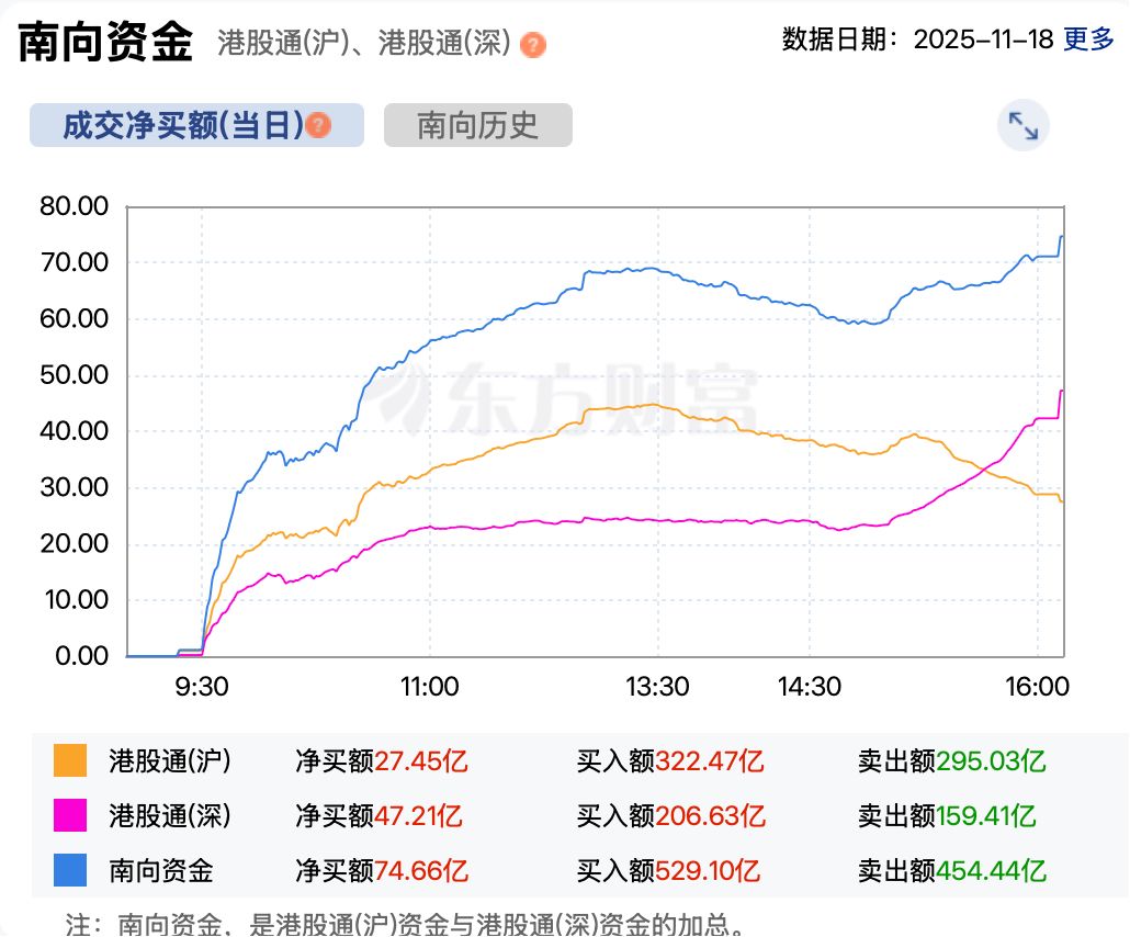 资金方面,截至收盘,南向资金累计净买入港股超74亿港元。