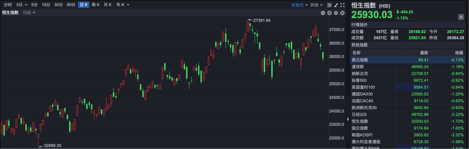 截至收盘,恒生指数跌破26000点整数关,最终报收于25930.03点,下跌454.25点,跌幅1.72%。
