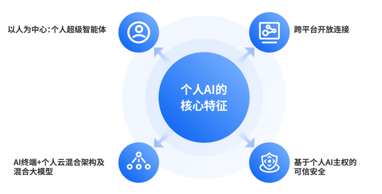王吉平介绍了个人AI具备的四大特征:以人为中心的个人超级智能体,AI终端+个人云的混合架构及混合大模型,跨平台开放连接,基于个人AI主权的可信安全。他表示,个人AI时代,人与AI的关系将是“双向奔赴”。