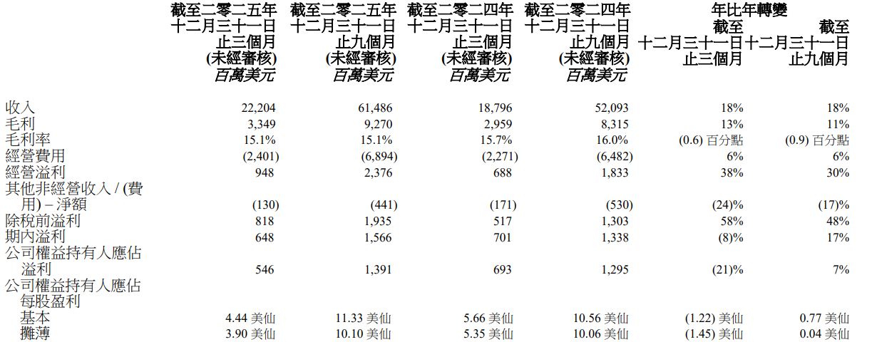 联想集团:第三季度营收222亿美元 不及预期