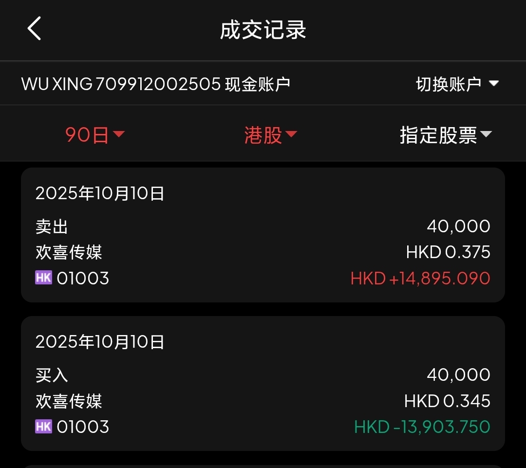 $欢喜传媒(HK|01003)$ T+0割了一回韭菜,入账980元港币。