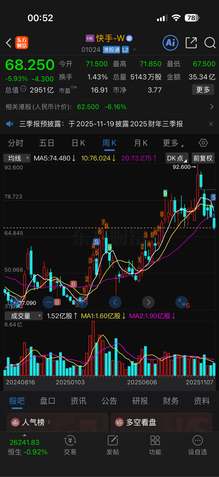 $快手-W(HK|01024)$ 本来不想卖的,毕竟持仓不多,看周线跌破位了,还是没忍住给卖了,收益近80%,回侧了30%,正常来说回测这么多位置也差不多跌到位了,,,,,过几天位置差不多,我在接回来。少赚当赢了