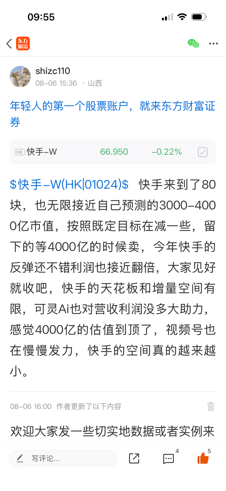 回来看看老朋友还在不在,市值4000亿的时候已经清仓。目前看快手财报没问题但是天