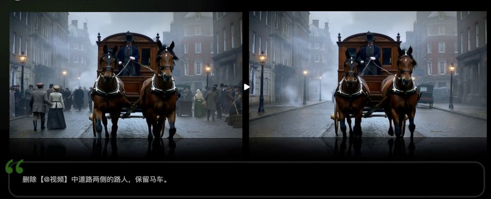 比如,在输入区输入“删除【视频】中道路两侧的路人,保留马车”,修改后的视频保持了主体的一致性,对被删除的内容进行了相对干净的抹除。