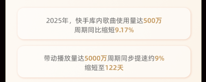 报告显示,在快手搜索音乐曲目的行为日均突破500万次,日均播放总时长同比增长5%,高黏性的消费习惯与主动化的消费行为,标志着快手用户音乐消费进入深度阶段,大幅缩短了歌曲从“被创作者使用”到“被用户观看”的传播周期。2025年,快手曲库内歌曲使用量达500万次,其传播周期同比缩短9.17%;带动播放量突破5000万的爆款歌曲,传播周期同步提速约9%,缩短至122天,实现了歌曲热度的快速发酵。