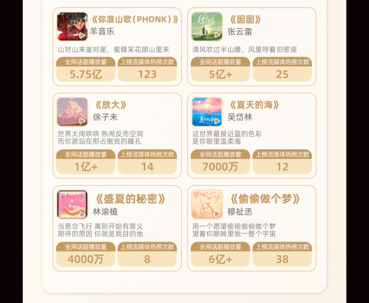 生态根基的持续稳固,推动音乐消费场景向全领域扩散。目前,快手平台音乐内容已全面覆盖“三农”、青春娱乐、泛知识等超50个垂类。与此同时,歌曲应用场景不再局限于短视频创作,更延伸至站内活动、媒体合作、跨界联动等多元领域,进一步释放了音乐内容的商业价值与文化价值。