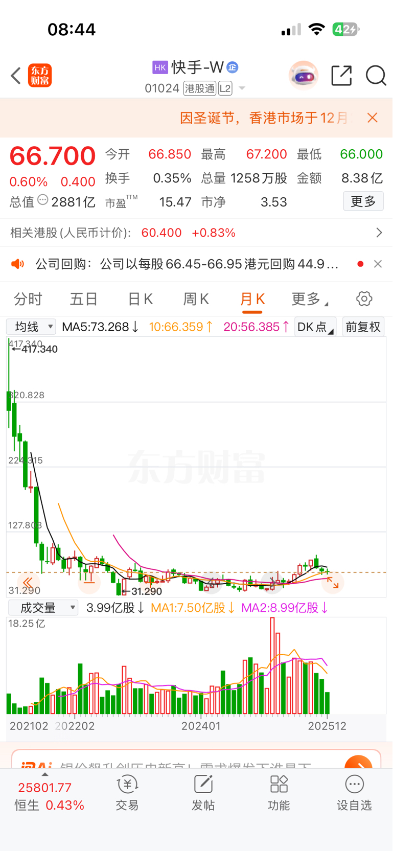 $快手-W(HK|01024)$ 66.70将是今年的最高价了