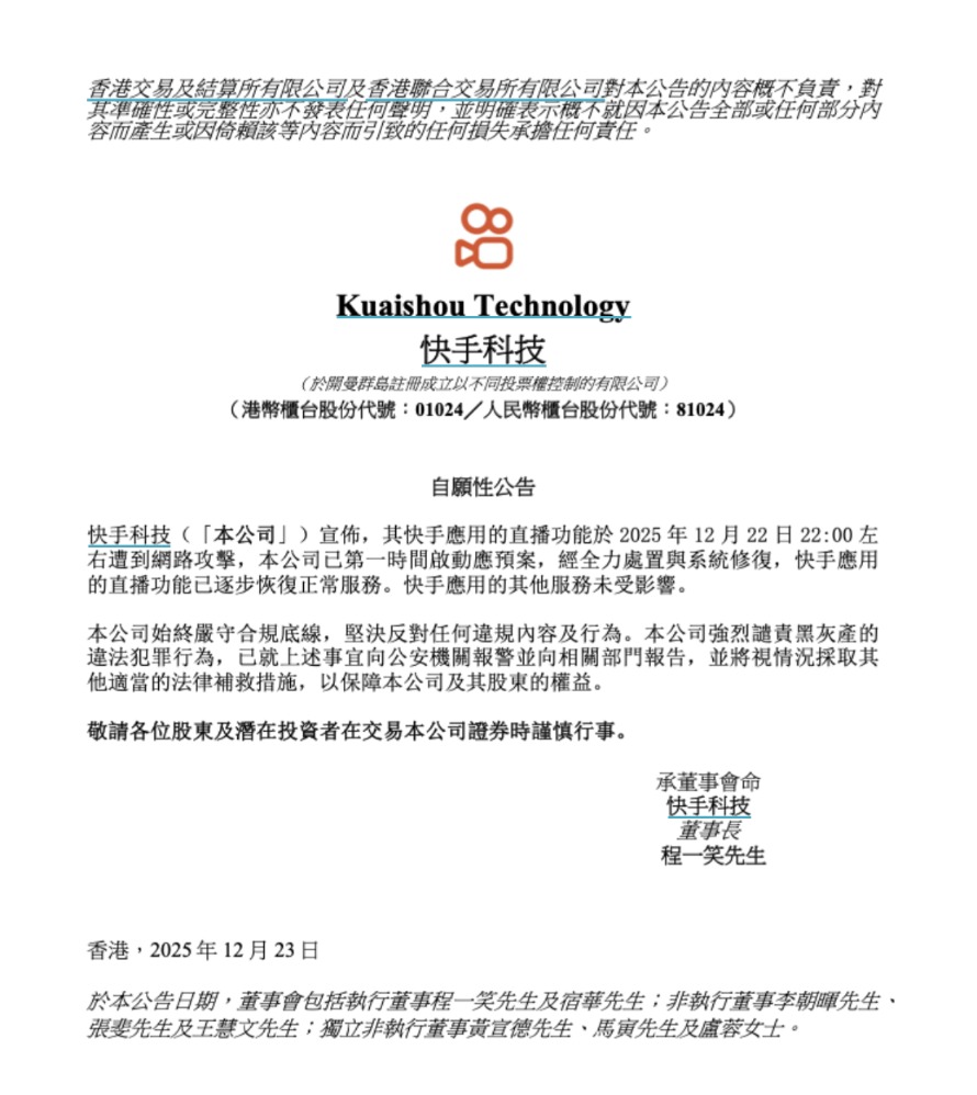 央广网北京12月23日消息(记者樊瑞)12月23日中午,快手(01024.HK)在港交所发布公告称,公司快手应用的直播功能于2025年12月22日22:00左右遭到网路攻击,公司已第一时间启动应急预案,经全力处置与系统修复,快手应用的直播功能已逐步恢复正常服务。