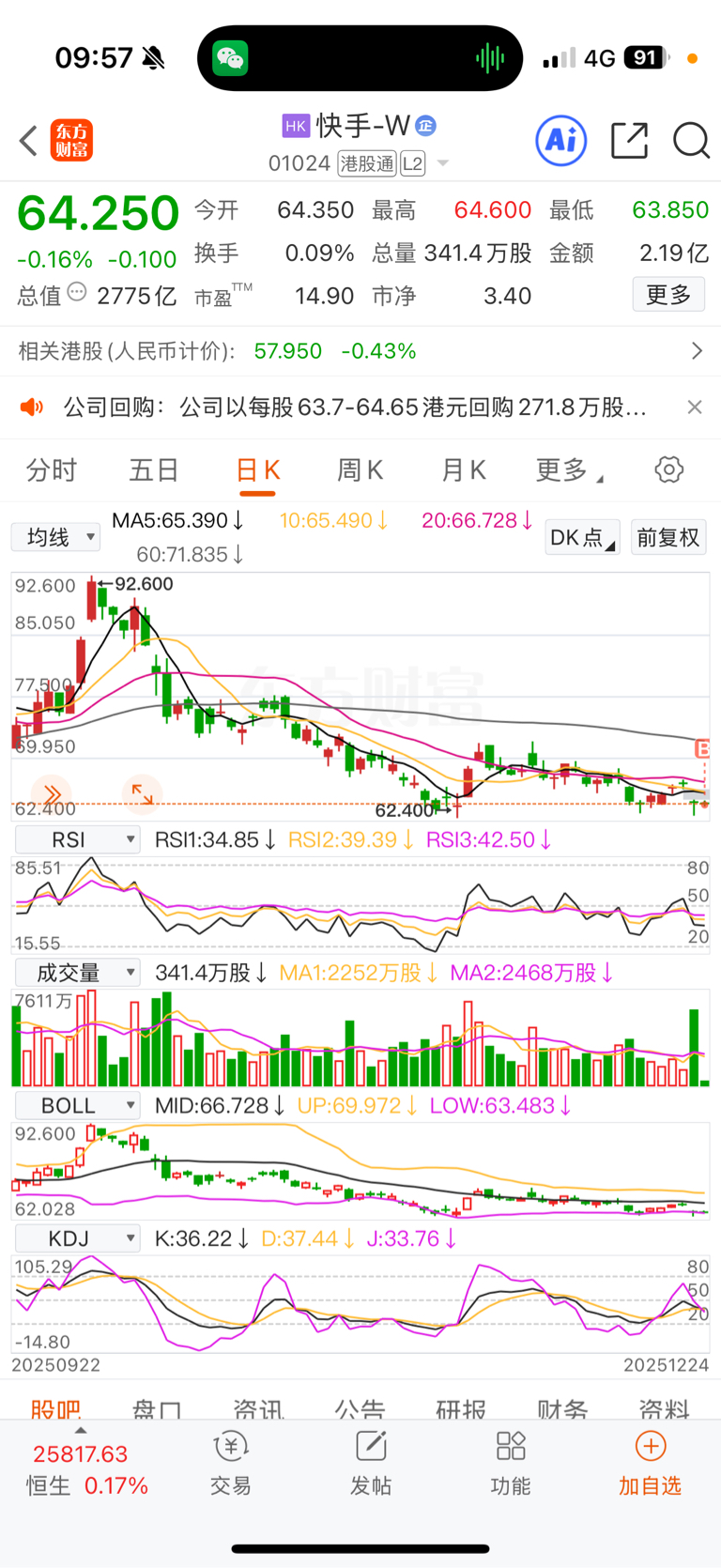 $快手-W(HK|01024)$ 连续下跌,出利空。财神到来,把筹接