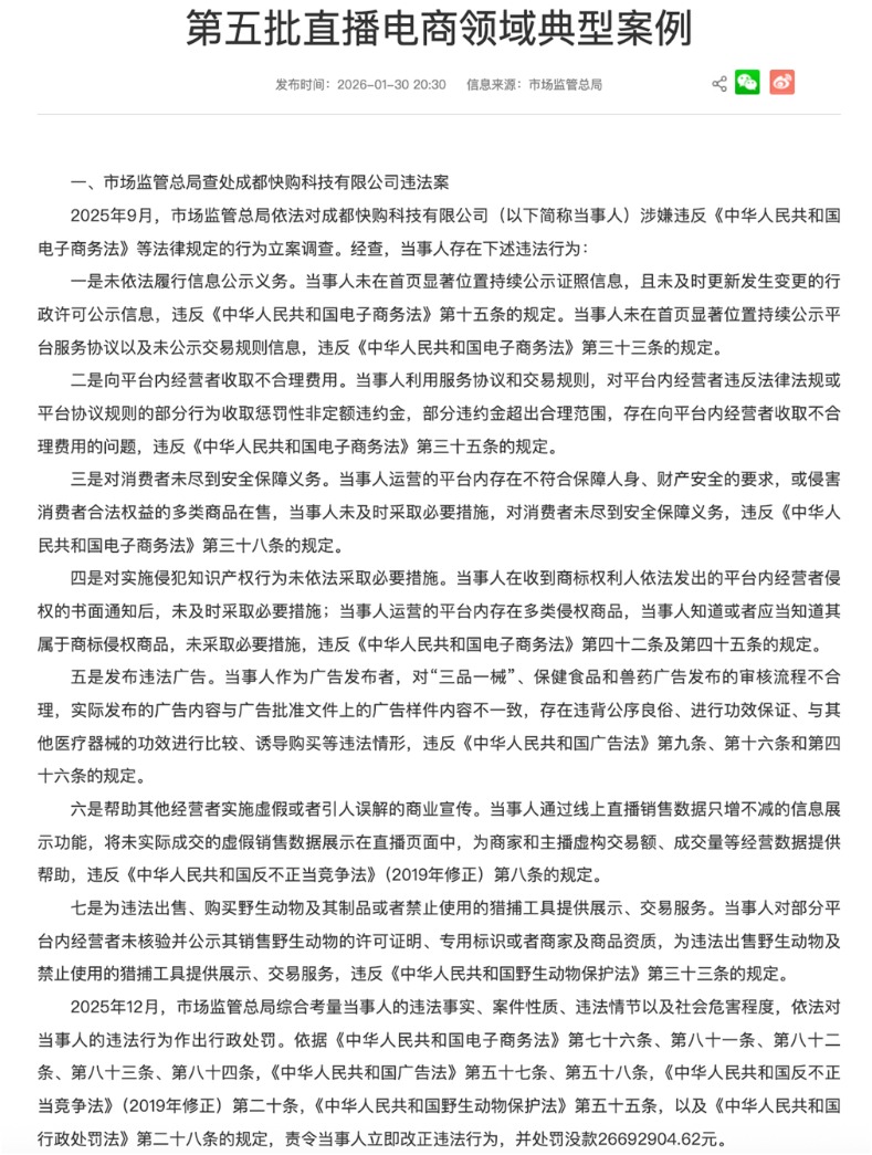 2026年1月底,市场监管总局公布了对快手子公司成都快购科技的行政处罚决定,罚没款高达2669.29万元,创下直播电商领域罚款金额新纪录。成都快购科技成立于2019年,是短视频平台快手的全资子公司,主要负责快手电商业务“快手小店”。