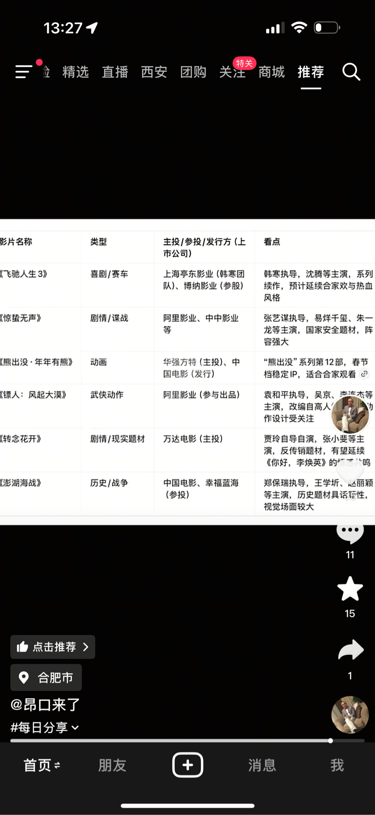 $大麦娱乐(HK|01060)$ 观察了一天 明天得搞点仓位了 刚查了一下 市场呼声最火的吴京镖人 易洋千玺张艺谋的惊蛰发行都是阿里影业 飞驰发行的是亭东 也有10 个点 股份是阿里影业 宣发也是找的大麦 OMG 这过年档 大麦娱乐完全是center 想想去年光线涨了多少过年期间 A股 中影已经开始发酵了 得布局一下了 $中国电影(SH600977)$