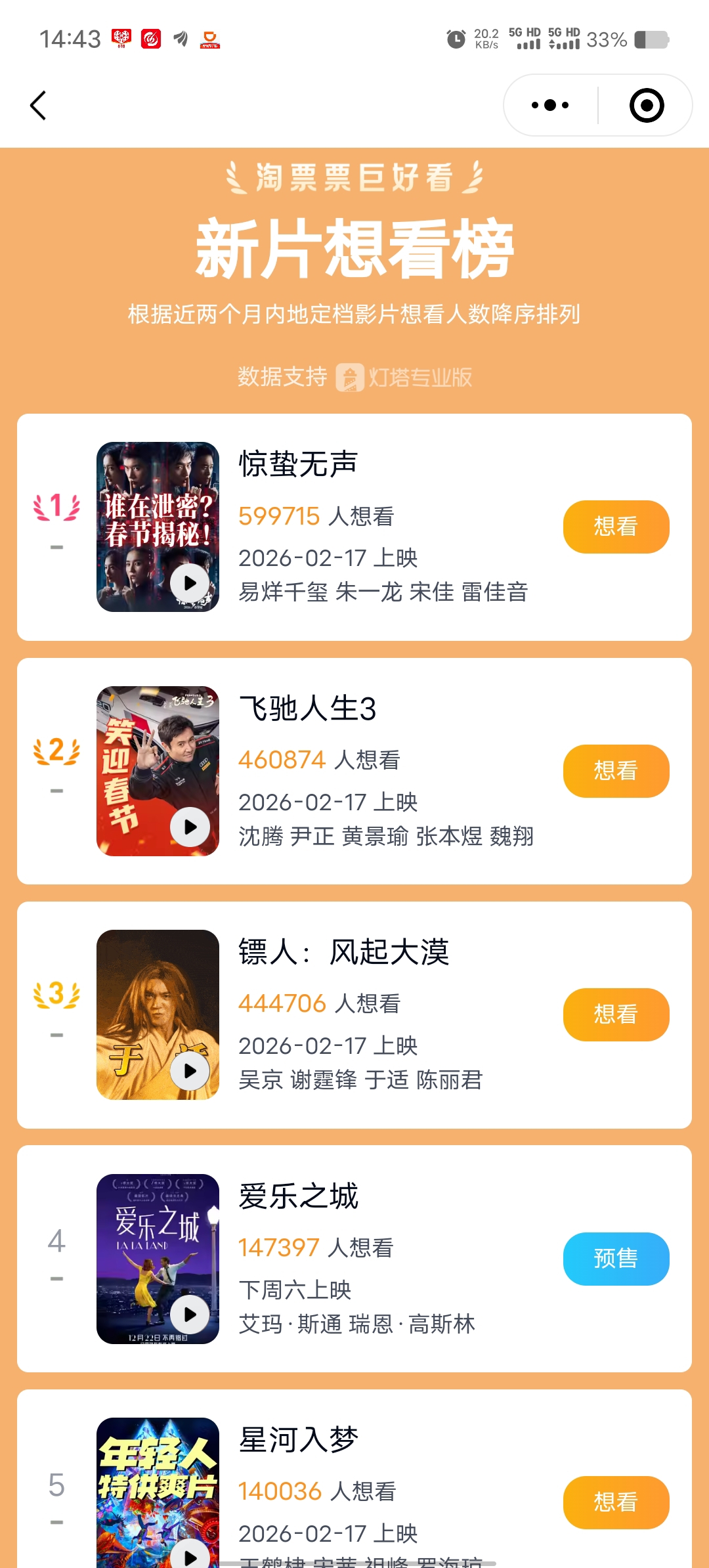 $大麦娱乐(HK|01060)$ 大麦娱乐,春节档大年初一有4部大片,三部大片想看排名第一第二第三。总票房有可能突破哪吒2。