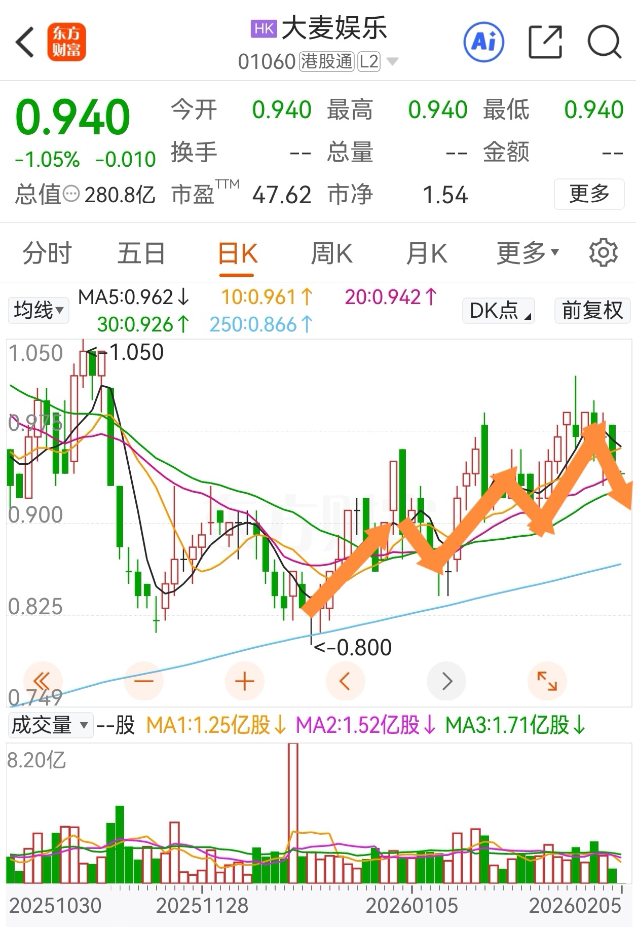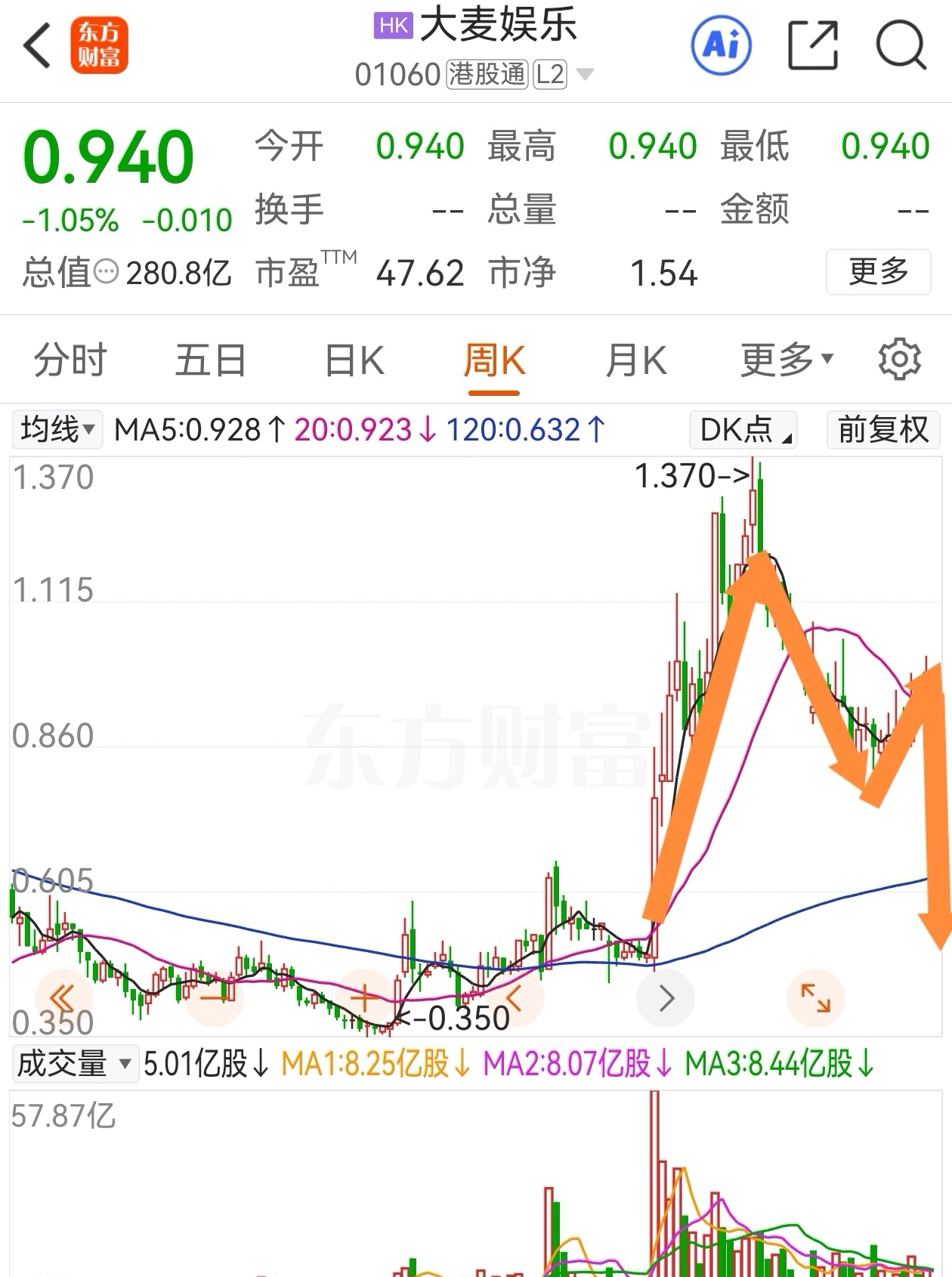 $大麦娱乐(HK|01060)$ 不妙,看形态,三浪反弹已结束,中继下跌已开始。