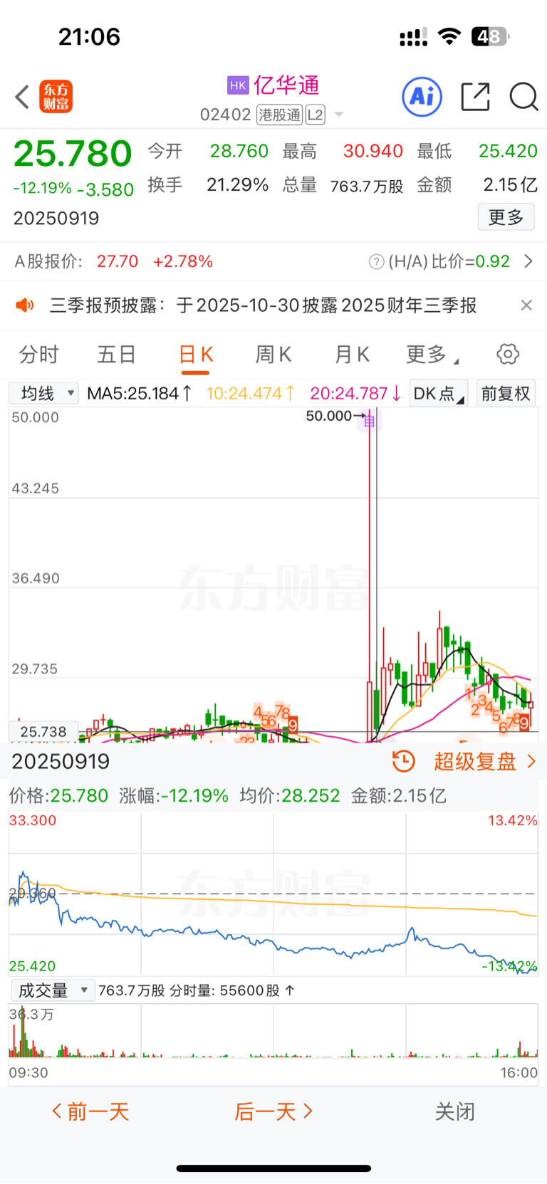$天津创业环保股份(HK|01065)$ 明天参考亿华通9月19日走势,亿华通最高涨100%,收盘回落到23%,第二天开盘直接下杀,收盘跌12.19%,前一天涨幅几乎跌没了,这还是在氢能源有利好的情况下!所以财姐建议大家明天开盘就跑,不要犹豫,尾盘接回来吃第二天的涨幅!$秦港股份(HK|03369)$