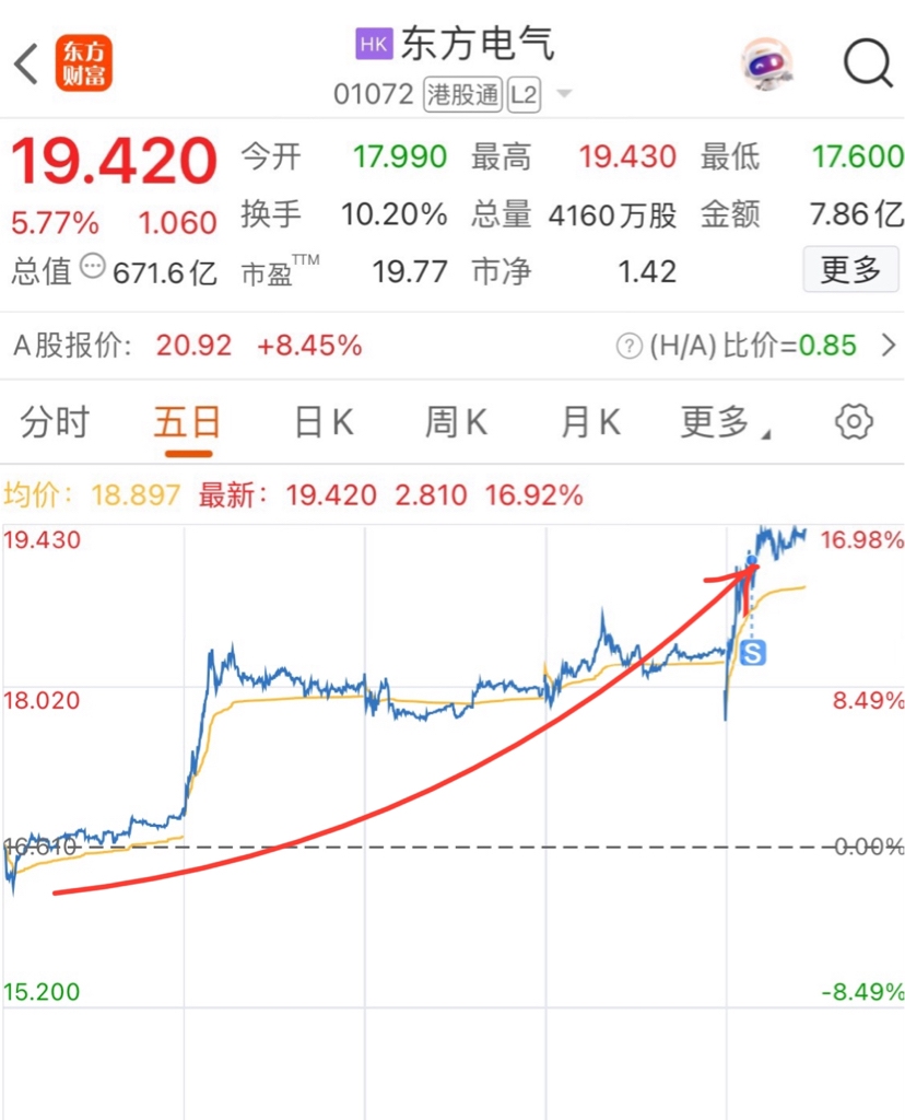 $东方电气(HK|01072)$ 从-2.1%到+16.98%,五日线已涨19%,个人感觉明天有可能回调,先出一部分