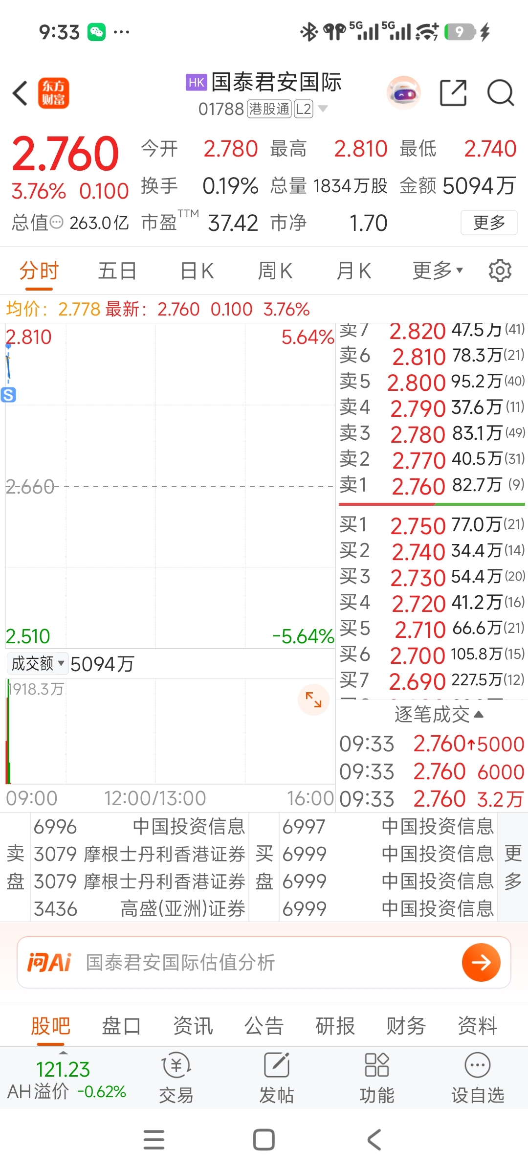 $东方电气(HK|01072)$ 周二抄底昨天清了!换了国泰君安国际,哎!的确是弱好多,不过国泰君安也是5%利润……$国泰君安国际(HK|01788)$ $上证指数(SH000001)$
