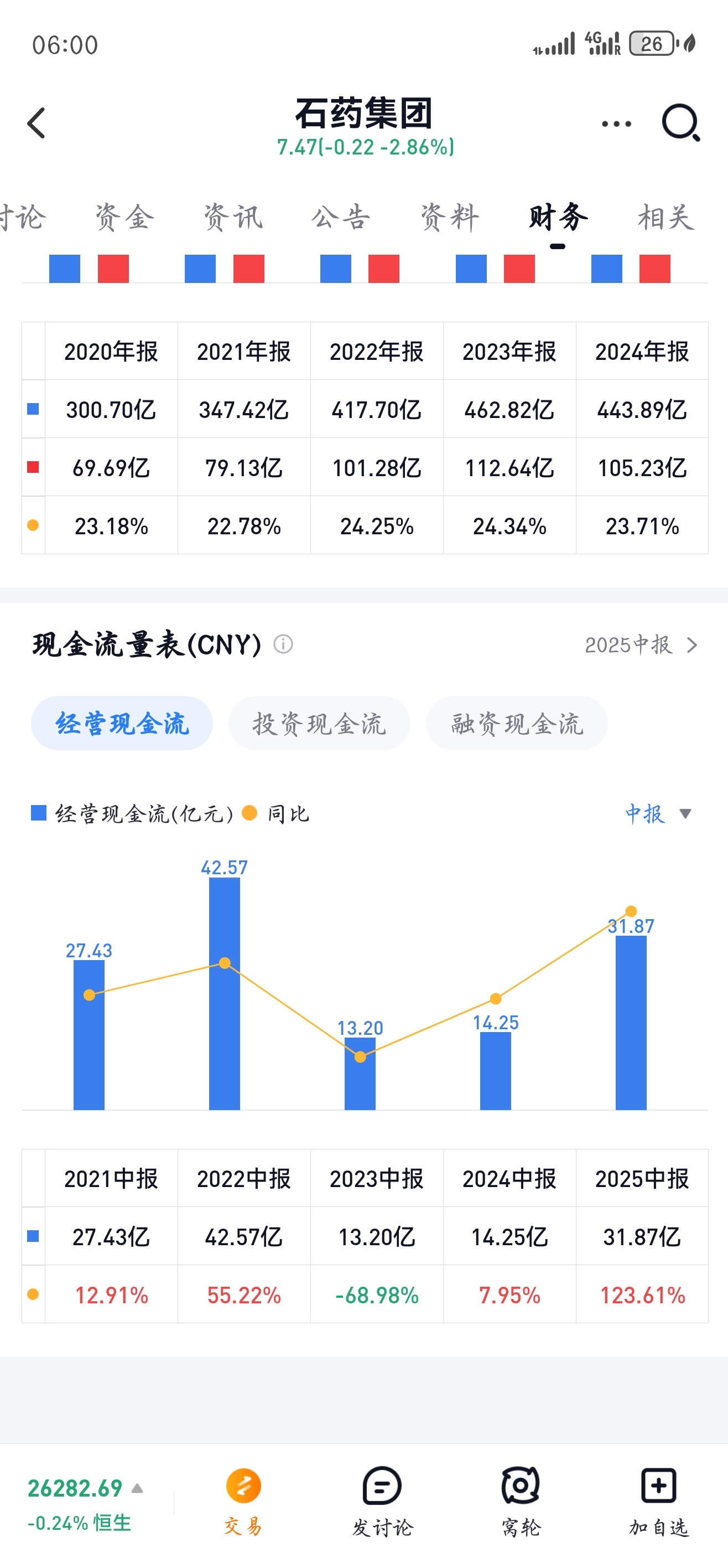 $石药集团(HK|01093)$ 大胆预测一下,我一般很少干这事,可是看到大家因为股价下跌了心情比较沮丧,还是免费提供一下心理按摩,随着bd预付款陆续到账三季报石药集团经营性现金流对比年初会有200%的增长。其实中报已经有了123%增长,只是大家懒不仔细去研究。