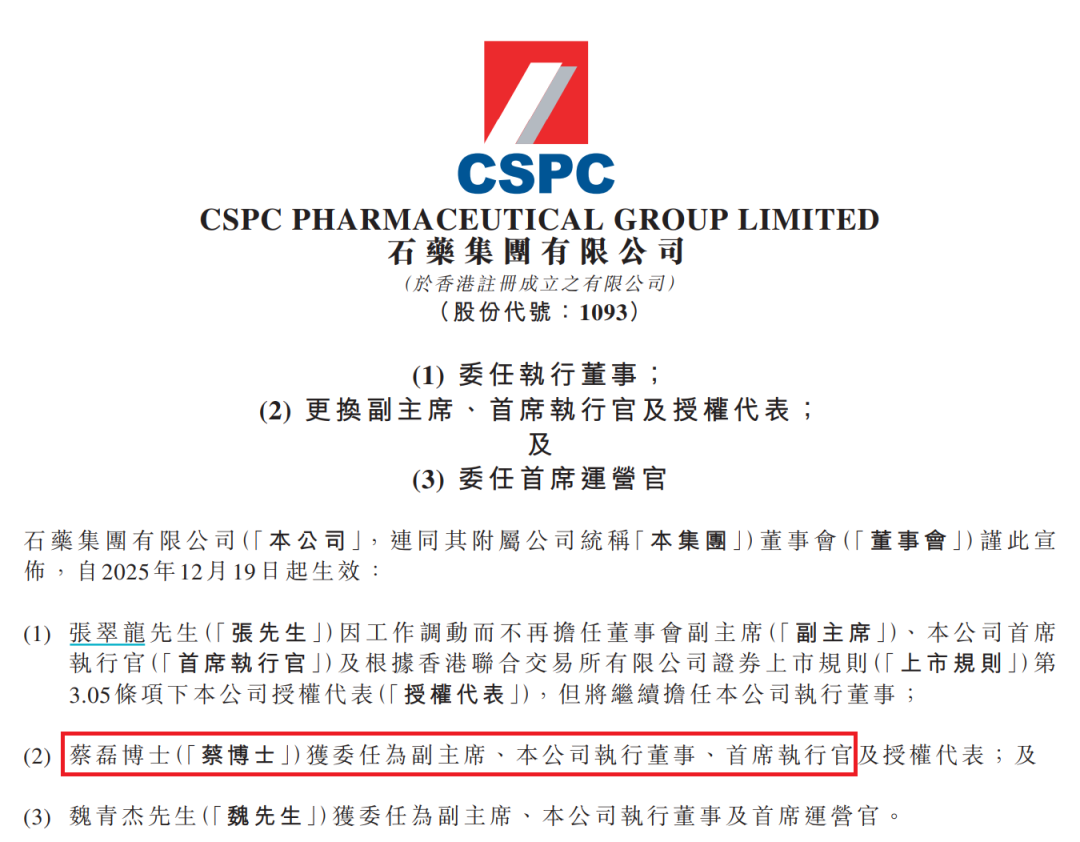 【导读】石药集团董事会主席蔡东晨之子蔡磊接任公司首席执行官