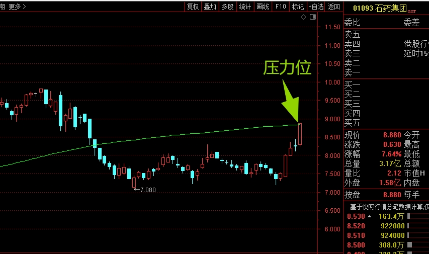 $石药集团(HK|01093)$ 近期反弹效果不错,连续拉升后,触碰到了前期跌破的大均线位置,目前大均线由前期的支撑位变了现在的压力位,接下来就看能否放量站稳,站稳就继续震荡看涨,但如果站不稳就要注意压力位的回落风险,前期有加仓的,这里可以先高抛落袋为主,或者是重仓的这里可以减一些仓位应对,等后期站稳了大均线再回补仓位也不迟。#炒股日记# #收盘点评#