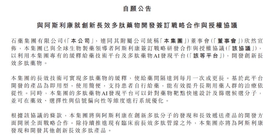 1月30日开盘前,石药集团(1093.HK)公告称,已与阿斯利康签署战略研发合作与授权协议。双方将依托石药集团专有的缓释给药技术平台及多肽药物AI发现平台,联合开发创新长效多肽药物。