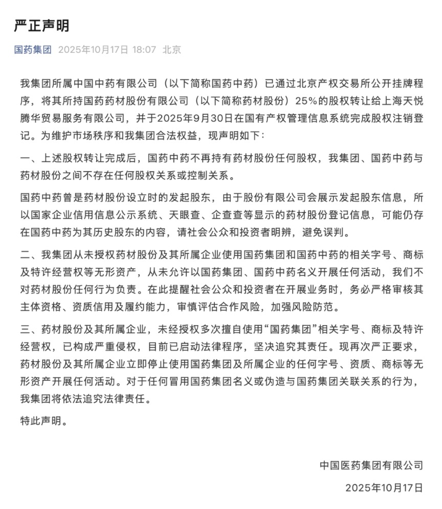 10月17日,中国医药集团有限公司(简称国药集团)发布声明称,集团所属中国中药有限公司(以下简称国药中药)已通过北京产权交易所公开挂牌程序,将其所持国药药材股份有限公司(以下简称药材股份)25%的股权转让给上海天悦腾华贸易服务有限公司,并于2025年9月30日在国有产权管理信息系统完成股权注销登记。
