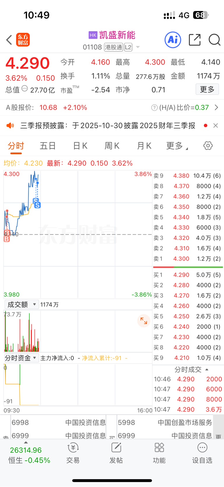 $凯盛新能(HK|01108)$ 感觉只是反弹,不算强势,没有外资参与做多!先走了!加油!凯盛!