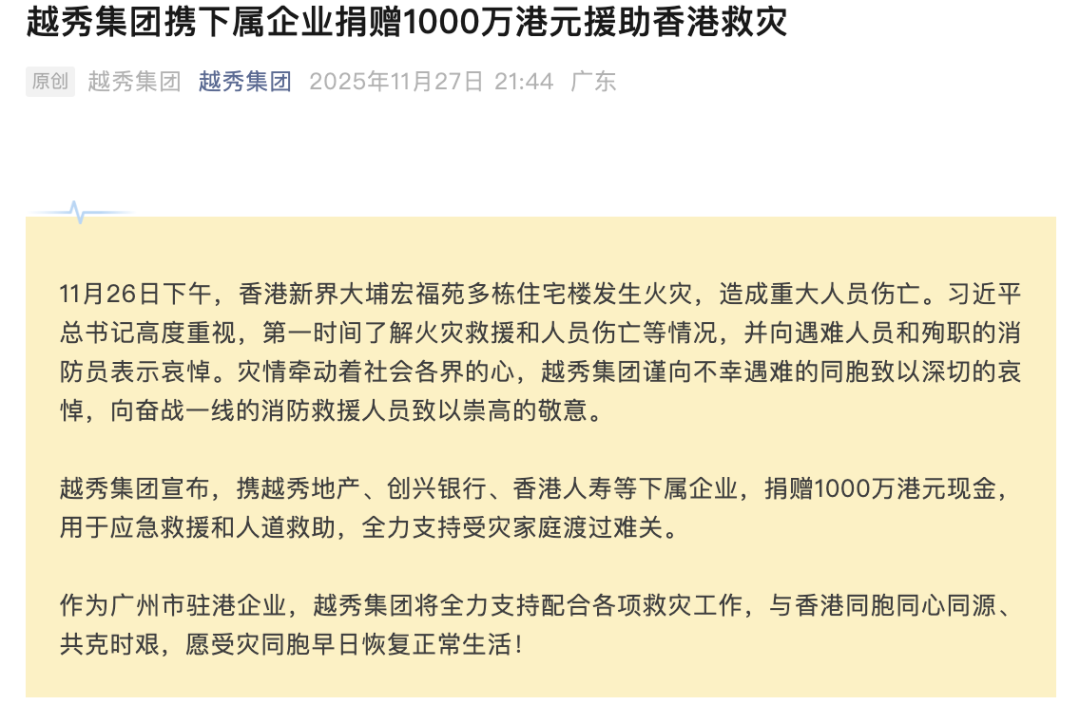 越秀集团亦宣布携越秀地产、创兴银行、香港人寿等下属企业,捐赠1000万港元现金,用于应急救援和人道救助,全力支持受灾家庭渡过难关。
