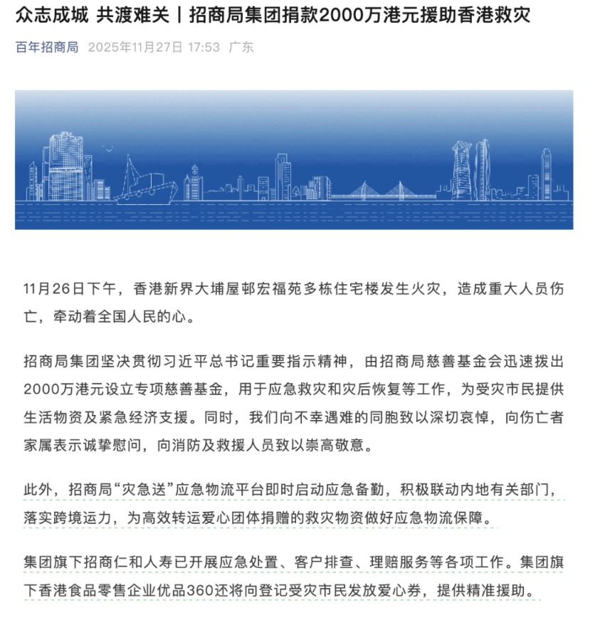 招商局集团则通过慈善基金会拨出2000万港元设立专项慈善基金,用于应急救灾和灾后恢复等工作,为受灾市民提供生活物资及紧急经济支援。