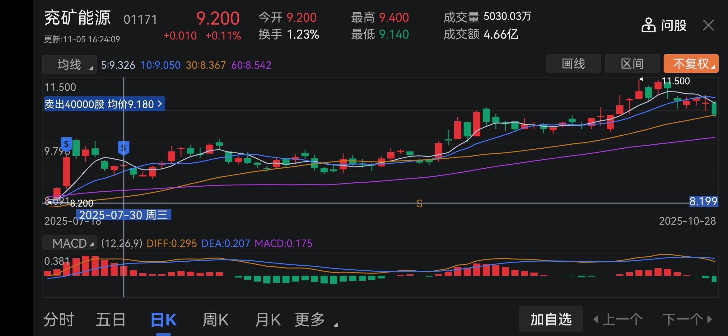 $兖矿能源(HK|01171)$ 说了找一只股票死守,但利润到了就忍不住跑了!虽然赚了不少,但也少赚了8万大洋!这次中远海控能够守得住赚大钱吗?
