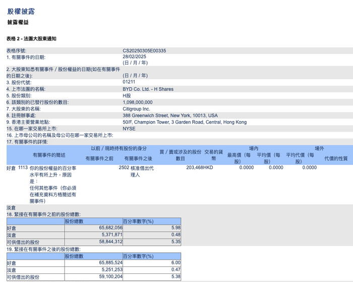 3月6日,据港交所权益披露,花旗集团在比亚迪股份的持股比例于2月28日从5.98%升至6.00%。