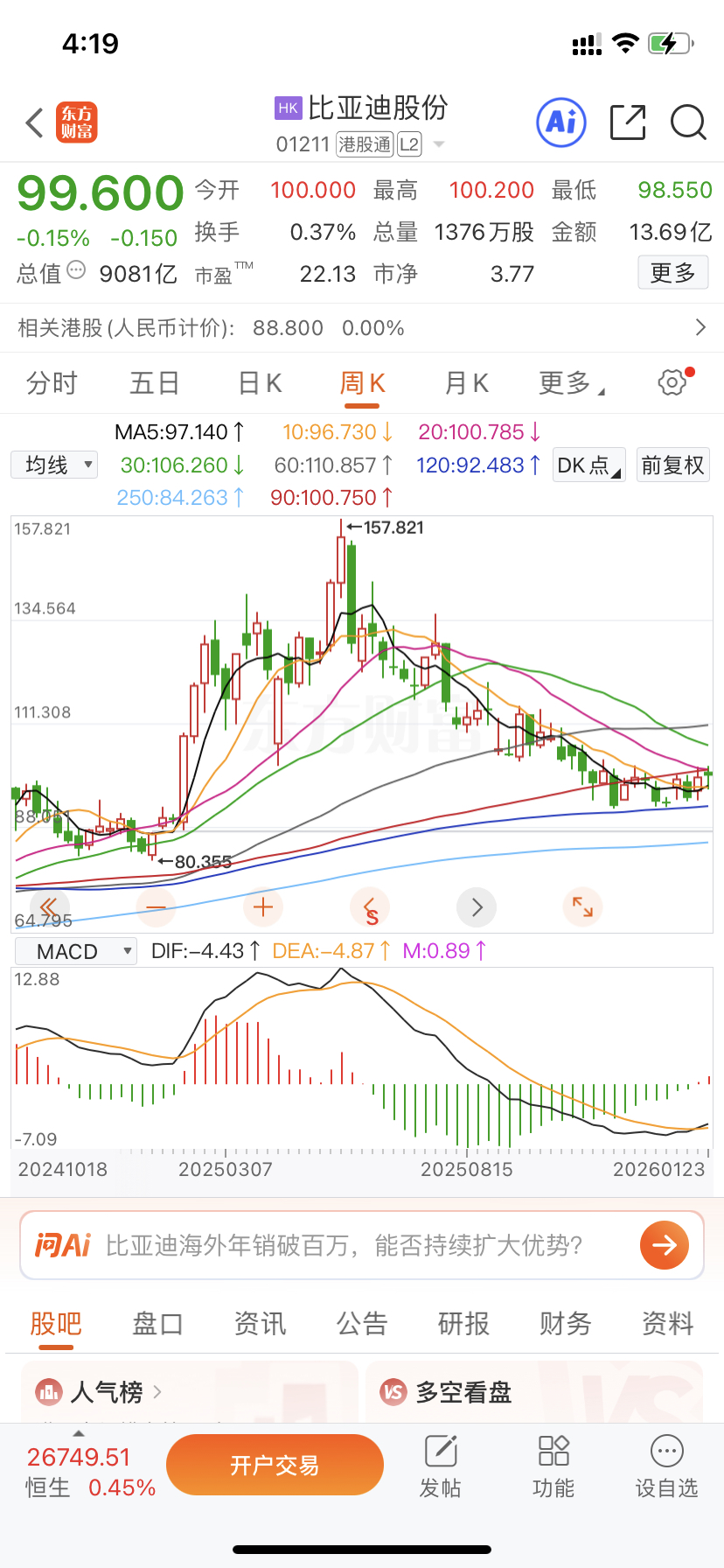 $比亚迪股份(HK|01211)$ 非常健康的走势,现在唯一的风险就是A股拖油瓶