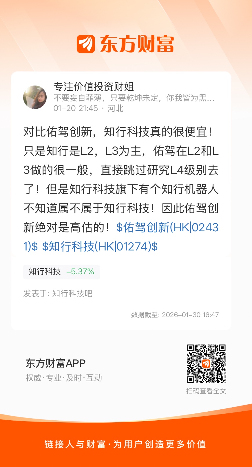 对比佑驾创新,知行科技真的很便宜!只是知行是L2,L3为主,佑驾在L2和L3做的很一般,直接跳过研究L4级别去了!但是知行科技旗下有个知行机器人不知道属不属于知行科技!因此佑驾创新绝对是高估的!$佑驾创新(HK|02431)$ $知行科技(HK|01274)$