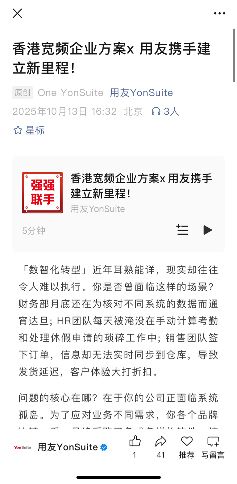 $香港宽频(HK|01310)$ 与用友合作双赢