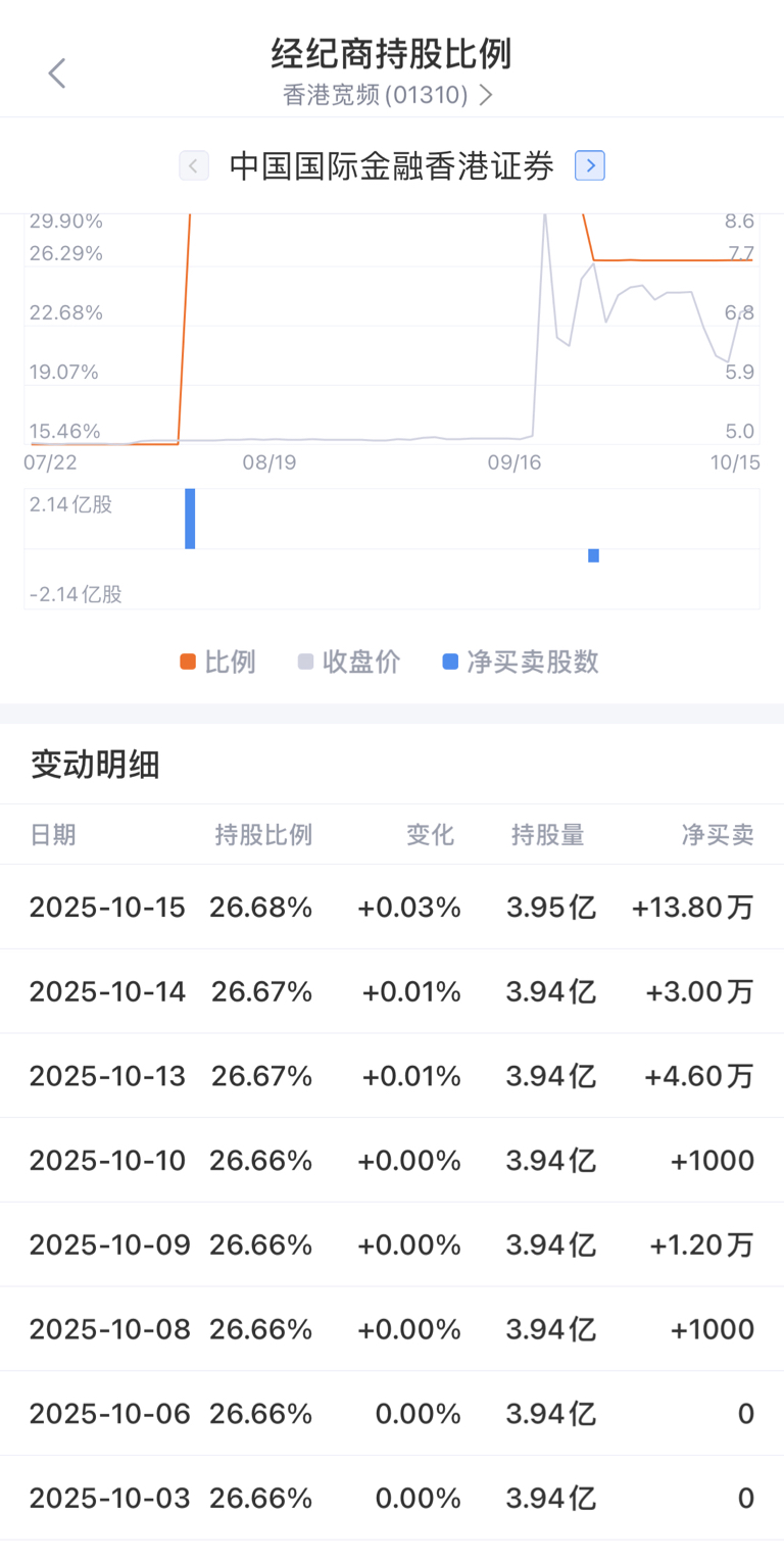 $香港宽频(HK|01310)$ 中金持续加仓买入中