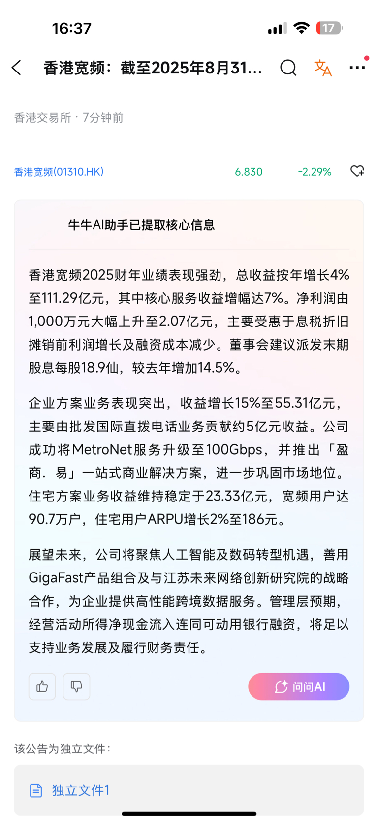 $香港宽频(HK|01310)$ 净利润2亿多一点 继续大比例分红