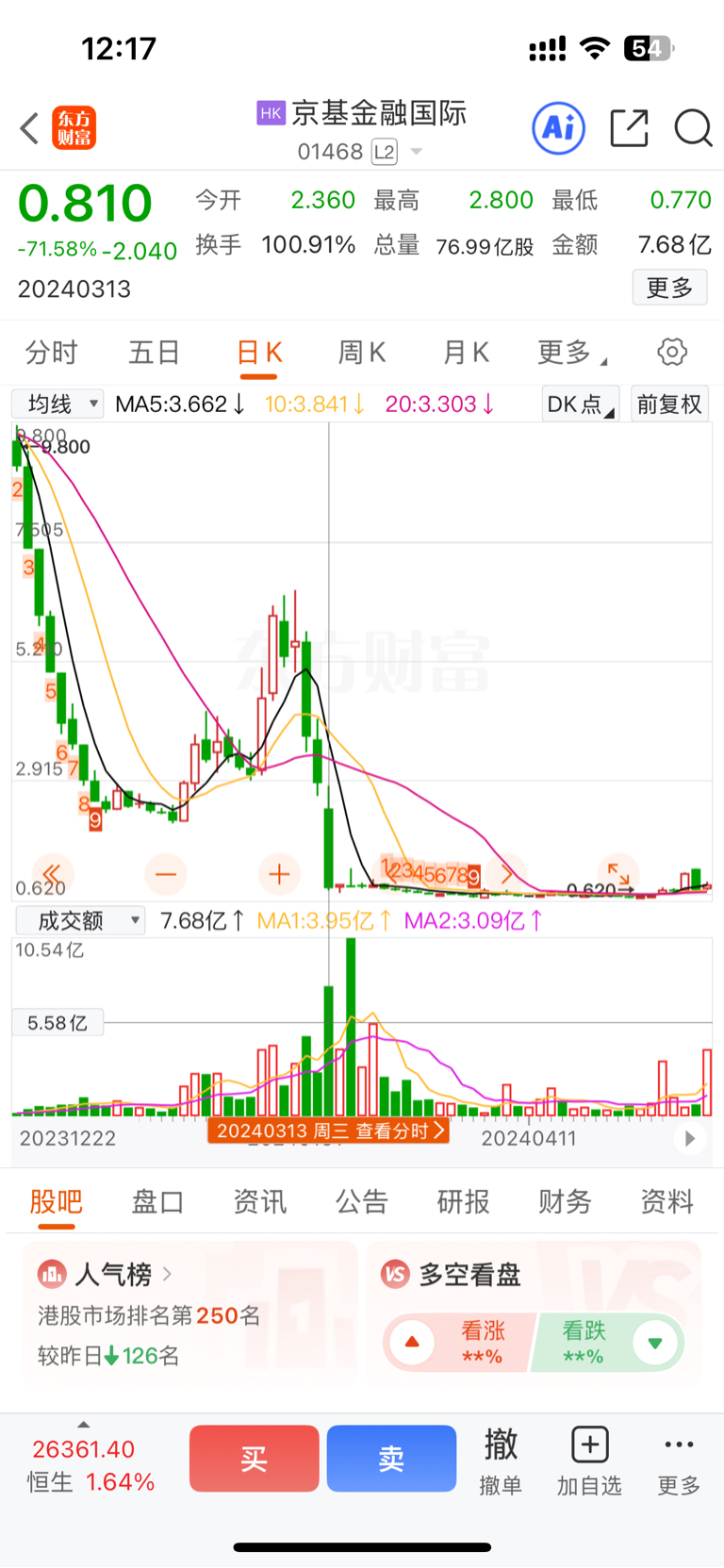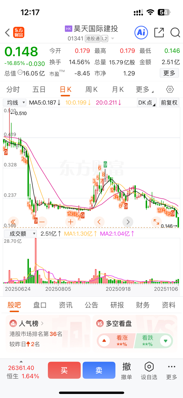 $昊天国际建投(HK|01341)$ 突然发现昊天国际操盘和京基金融是一个方式,都是下跌以后拉升一波吸引跟风盘,然后继续二次下杀暴击一网打尽,这是吸引港股通补仓或者抄底的出货方式!这个堪称香港金融圈教科书级别出货方式!家人们,又学到了。。。