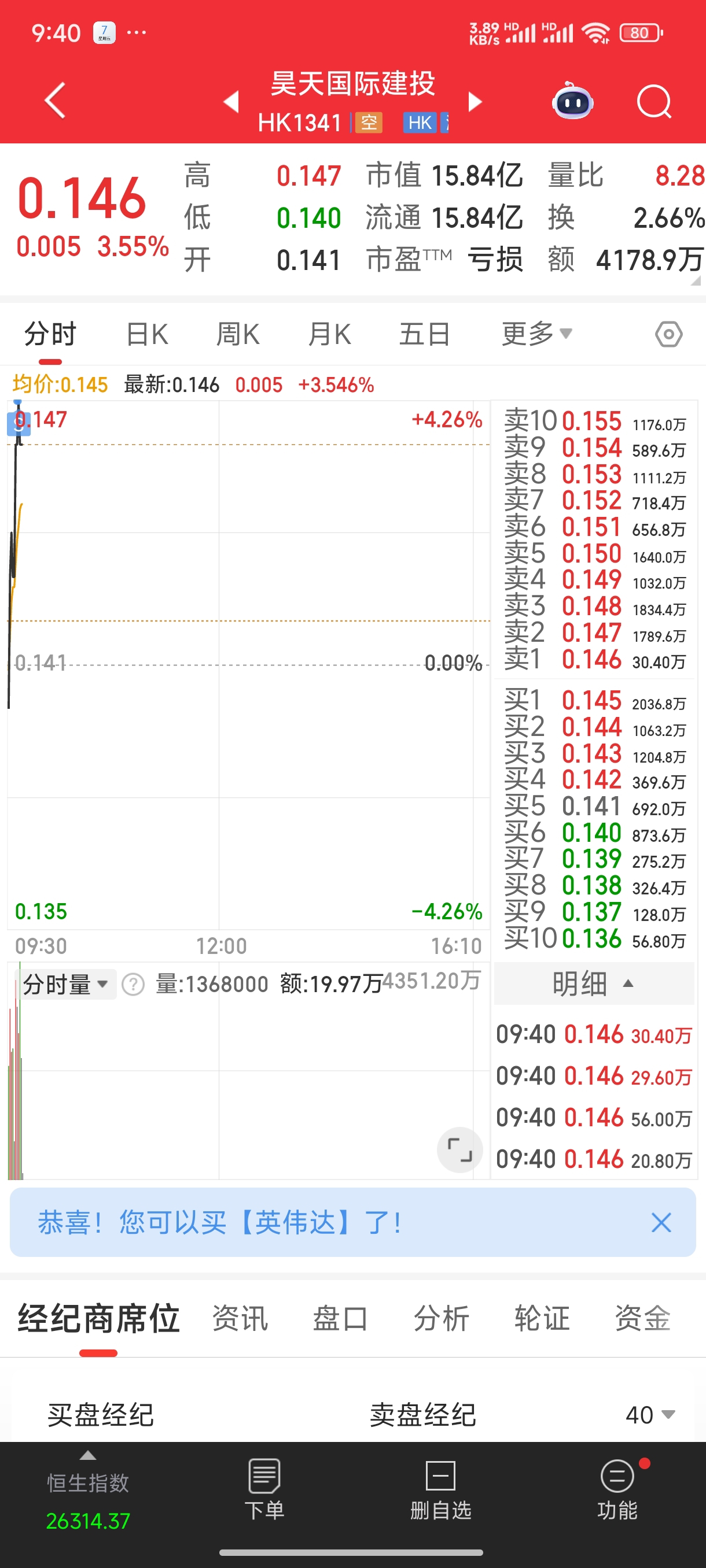 0.147走了,昨天0.141买的600万股,两回上0.146没走,一夜的焦虑不