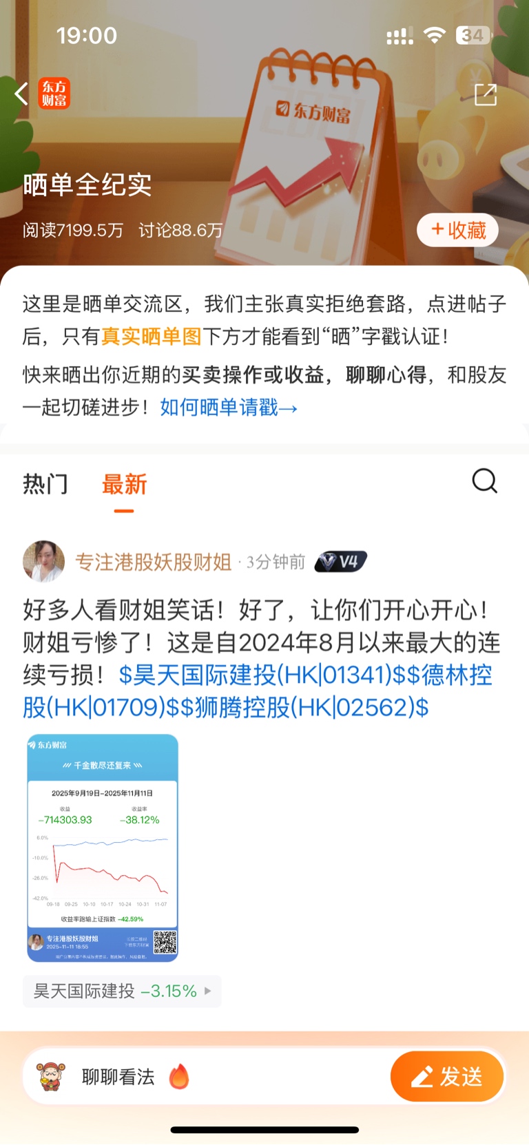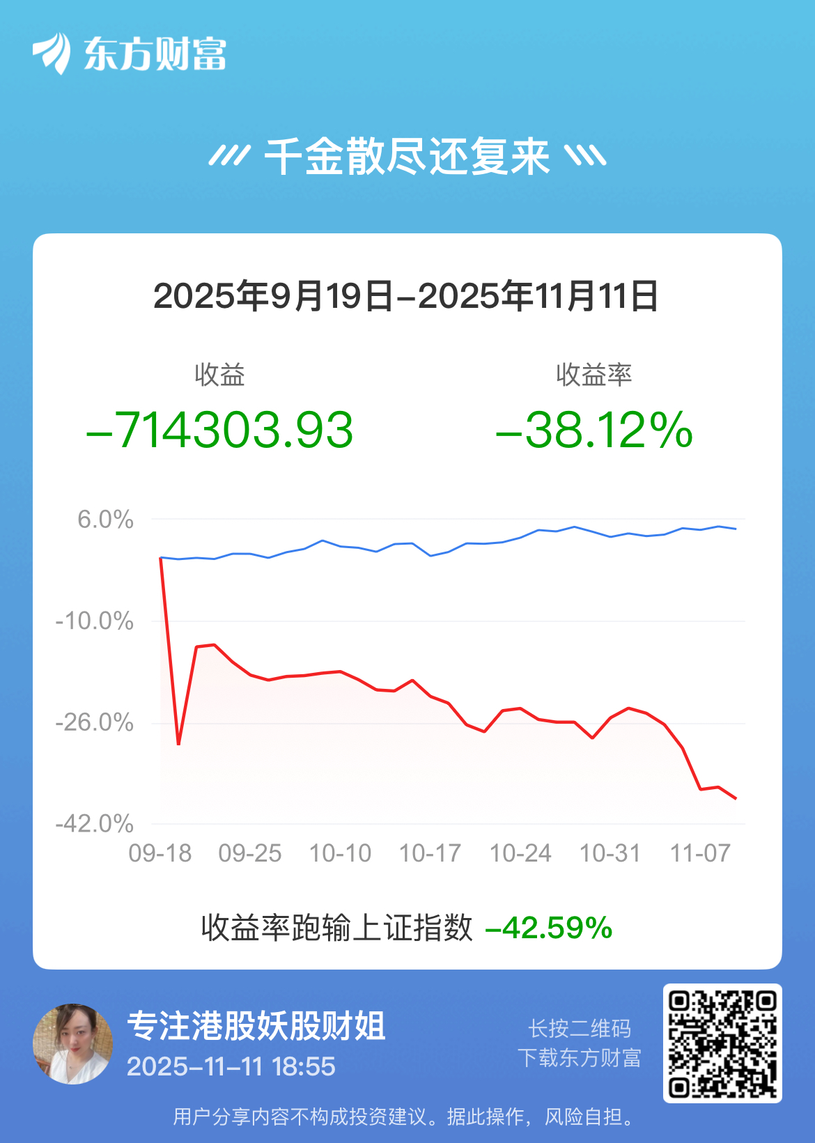 好多人看财姐笑话!好了,让你们开心开心!财姐亏惨了!这是自2024年8月以来最大的连续亏损!$昊天国际建投(HK|01341)$ $德林控股(HK|01709)$ $狮腾控股(HK|02562)$