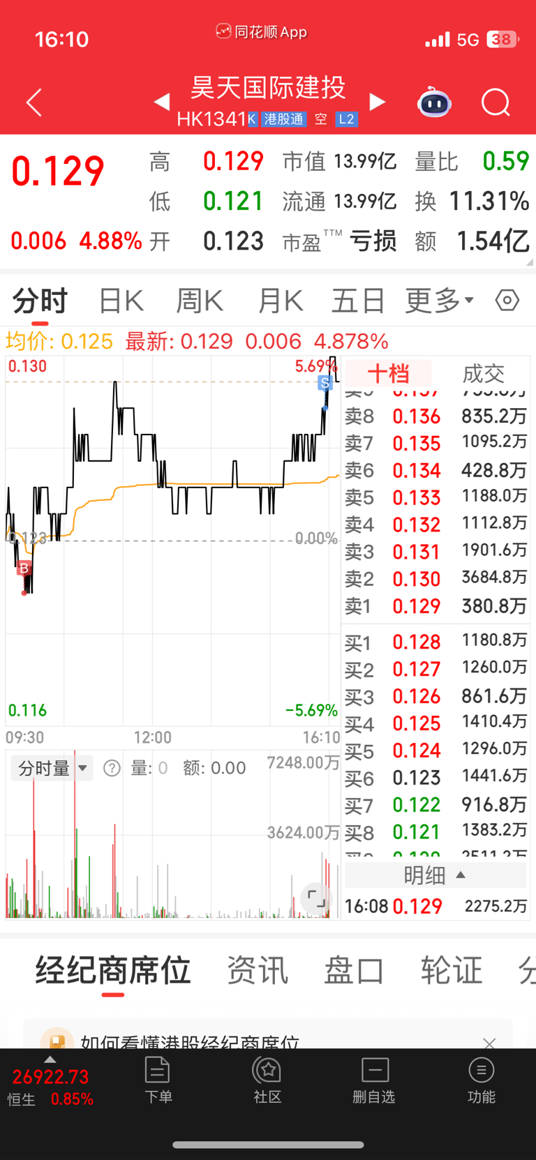 $昊天国际建投(HK|01341)$ 121进来,128跑了先,明天低开的几率大点,不过低开会高走的