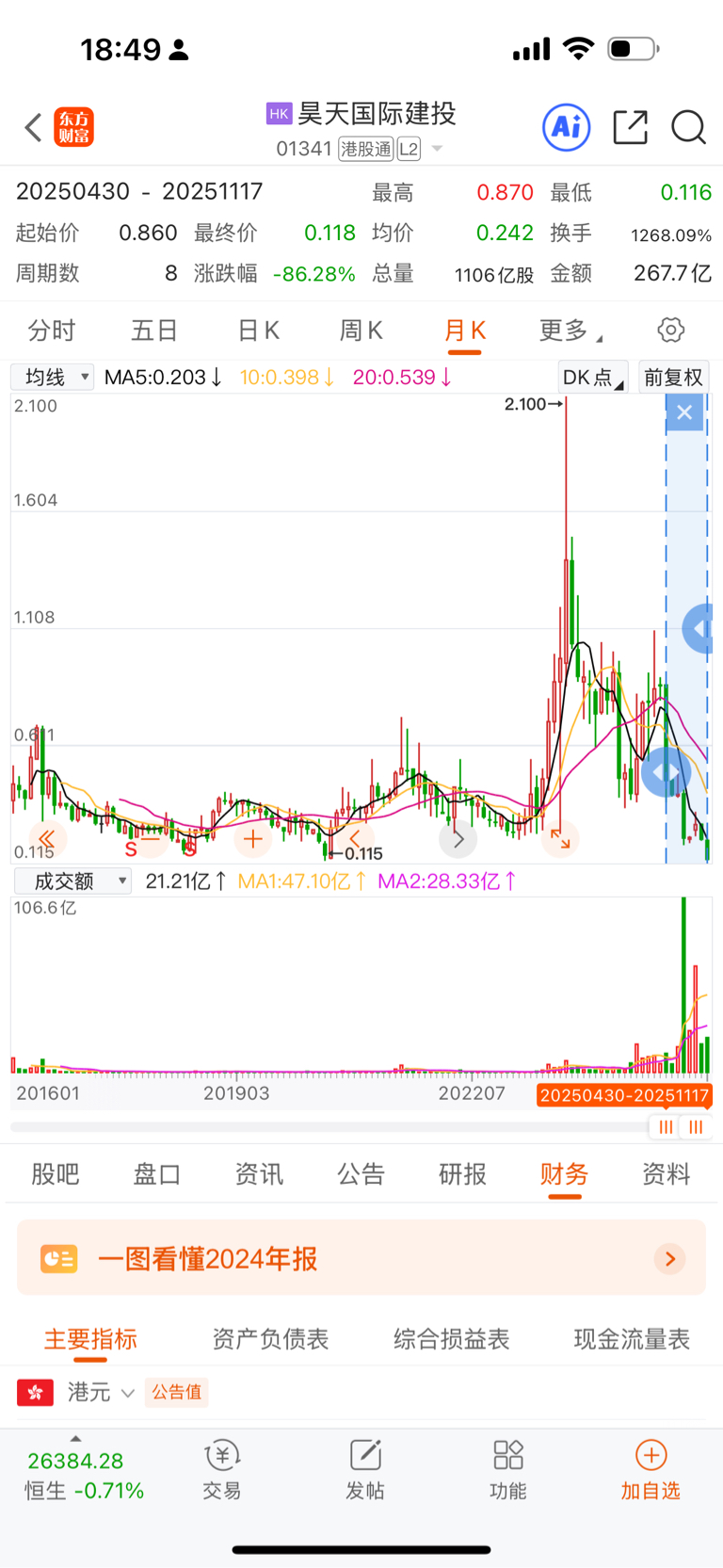$昊天国际建投(HK|01341)$ 半年不到跌86%,都是贪便宜的韭菜,价格又回到曾经的低点,玩这个纯属赌博!