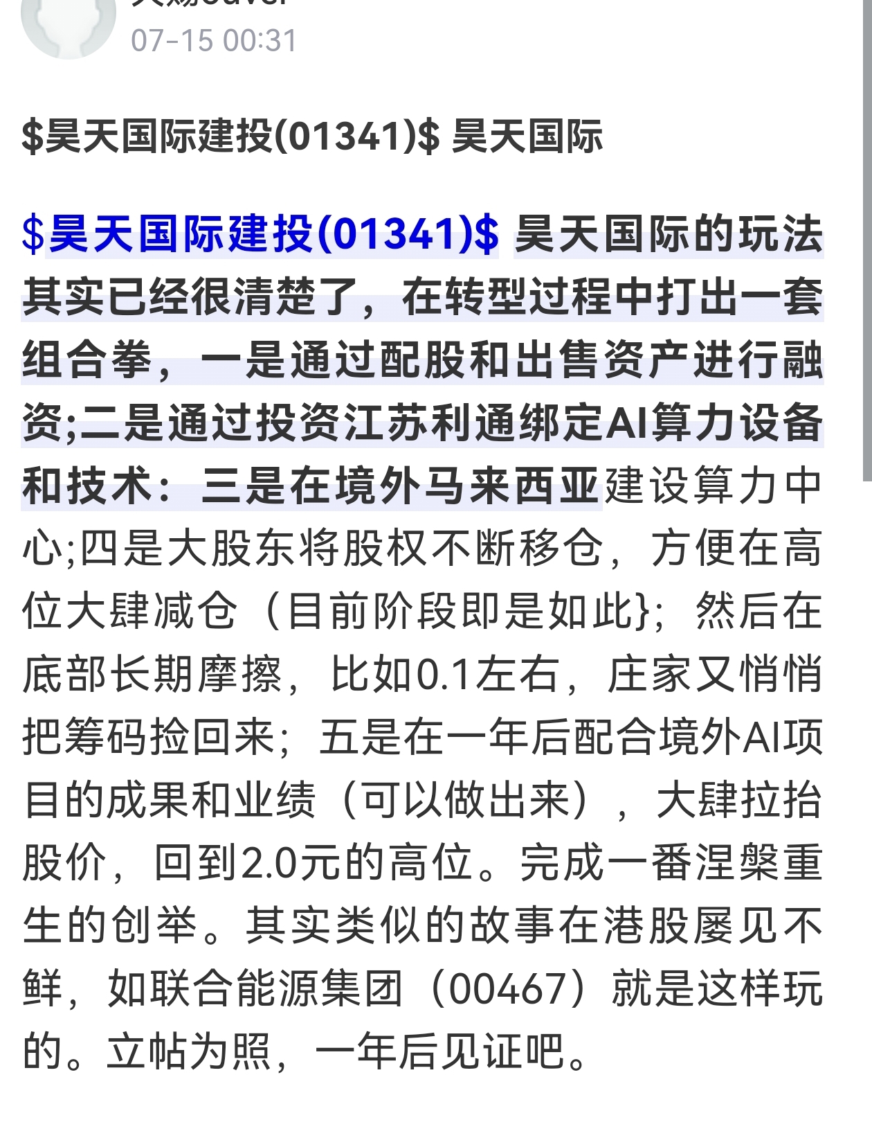 $昊天国际建投(HK|01341)$ 前面说的都实现了,希望后面的也能实现,一年内上2元