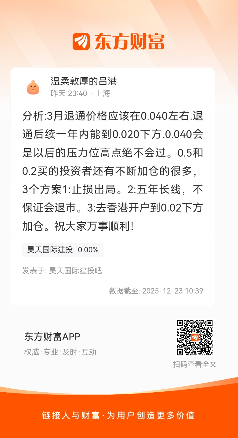 分析:3月退通价格应该在0.040左右.退通后续一年内能到0.020下方.0.040会是以后的压力位高点绝不会过。0.5和0.2买的投资者还有不断加仓的很多,3个方案1:止损出局。2:五年长线,不保证会退市。3:去香港开户到0.02下方加仓。祝大家万事顺利!