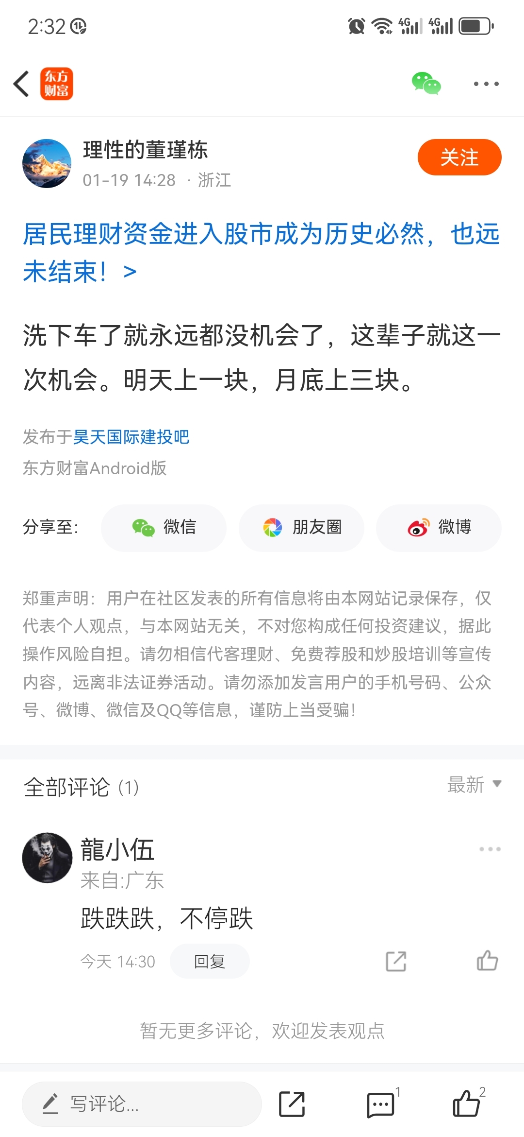 温馨提示: 1.根据《证券法》规定,禁止编造、传播虚假信息或者误导性信息,扰乱证券市场;2.用户在本社区发表的所有资料、言论等仅代表个人观点,与本网站立场无关,不对您构成任何投资建议。用户应基于自己的独立判断,自行决定证券投资并承担相应风险。《东方财富社区管理规定》