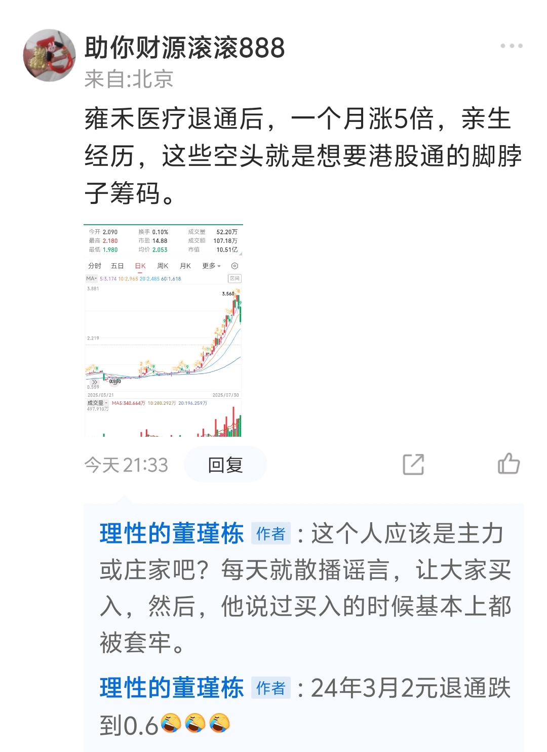$昊天国际建投(HK|01341)$ 大家注意雍和医疗24年3月退通时2元,退通后一直跌到0.6,到25年7月才上涨,这个人有目的,大家擦亮眼睛千万别上当