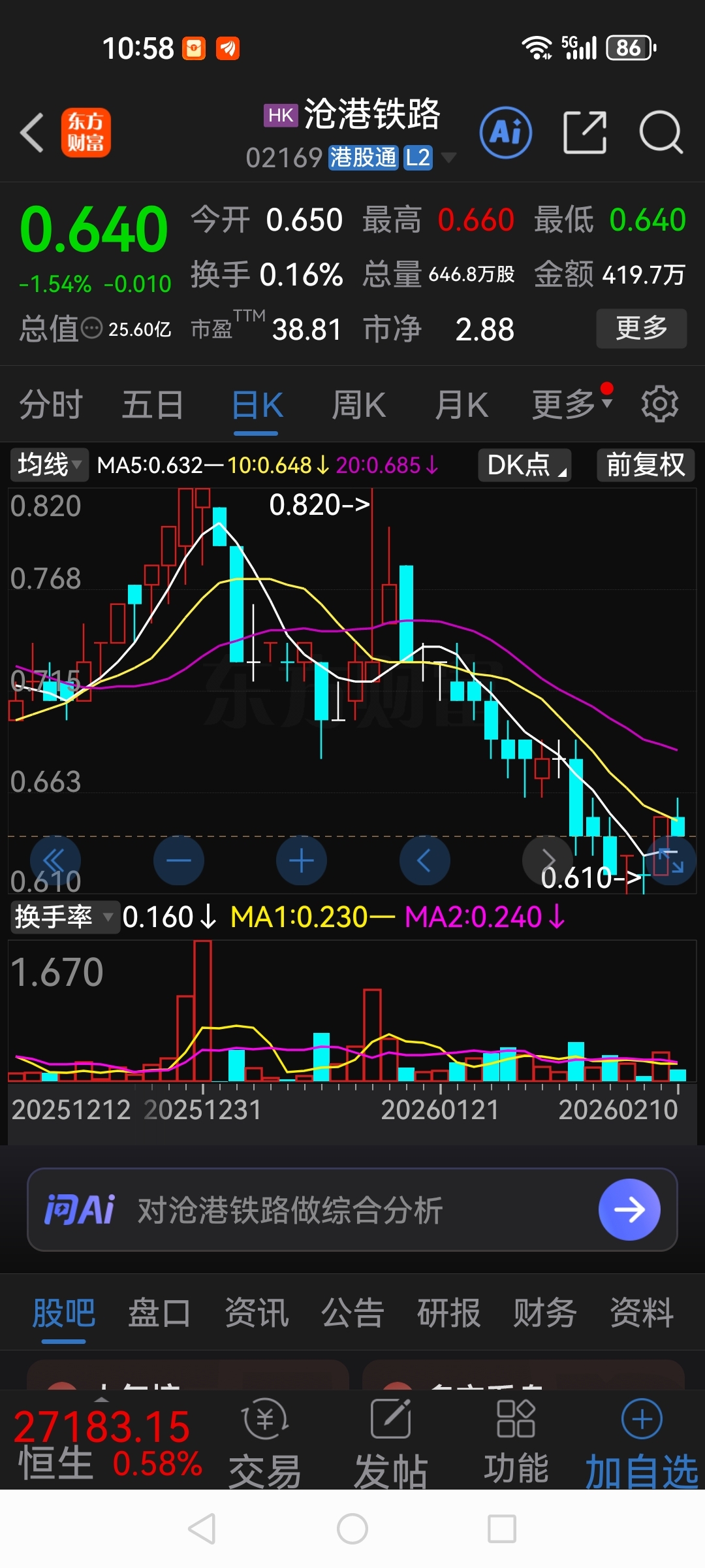 $昊天国际建投(HK|01341)$ 上午我就预言今天收盘价0.074元,各位不能对这只股抱有任何期望。一年多了,股价越来越低。0.071元不可能是真正的底部。我估计能跌到0.06元以下。各位可以观望证伪。看看沧港铁路这只股走势,或许能受到启发吧???