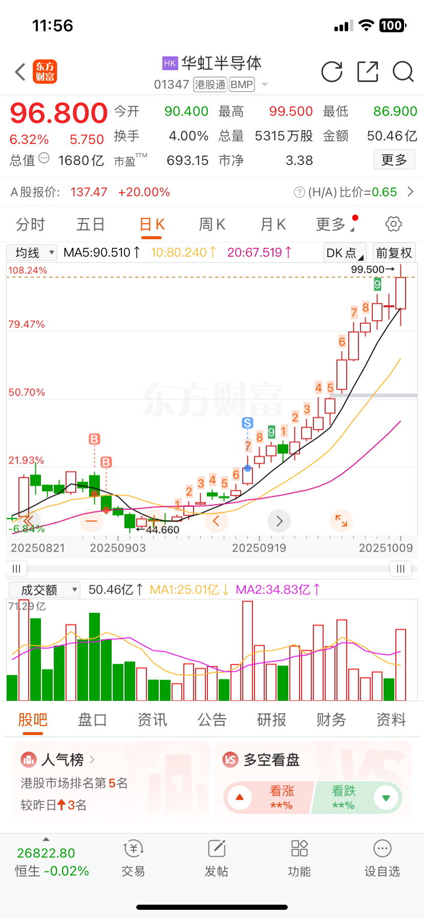 $华虹半导体(HK|01347)$ 你一直涨我的心里很难受呀