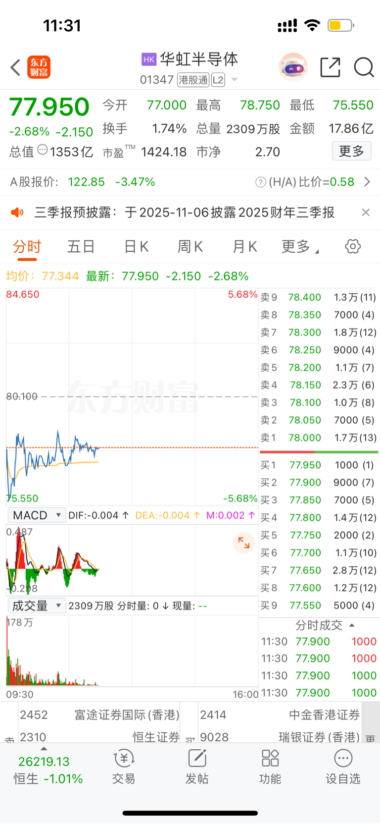 $华虹半导体(HK|01347)$ 主力你是知道我单价吗?围着我的单价位置横盘