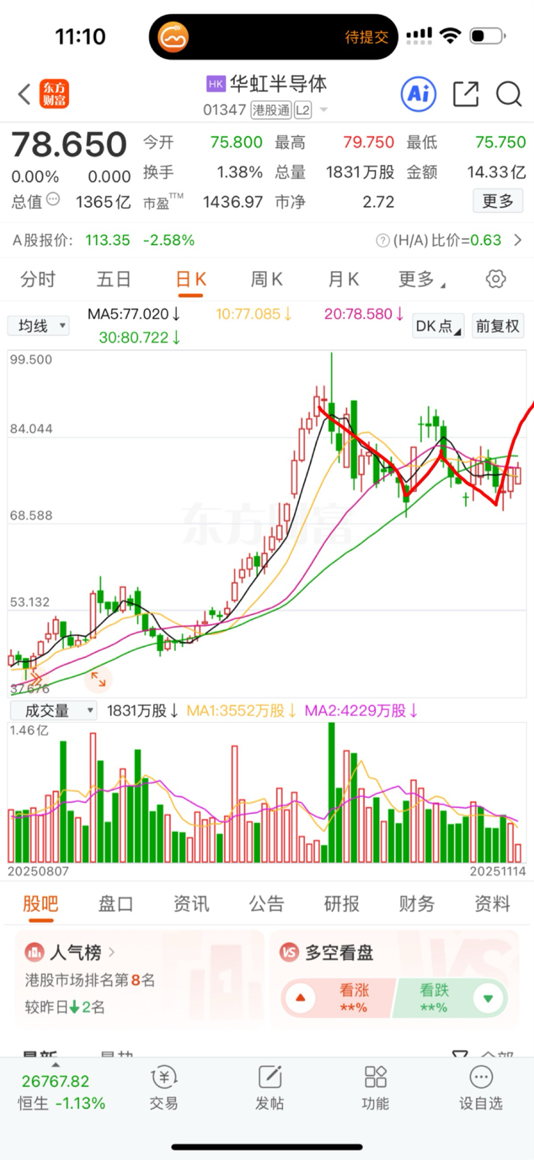 $华虹半导体(HK|01347)$ W走势,双底构筑